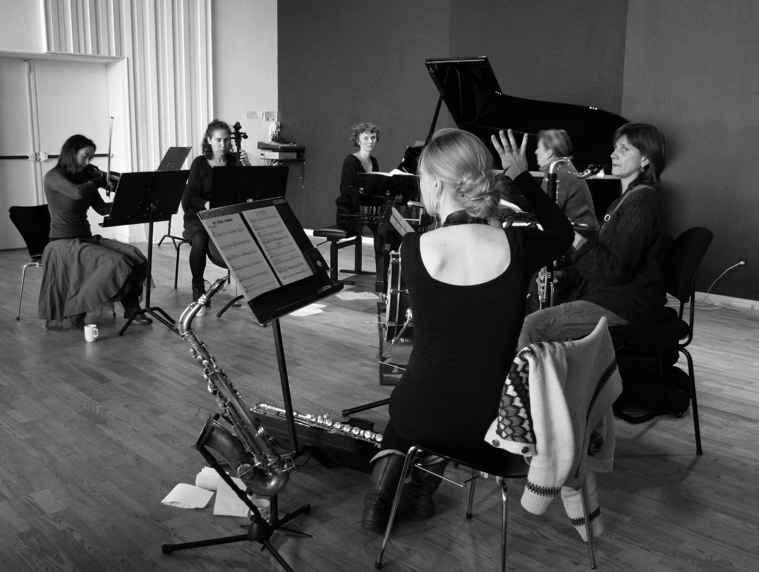 The ensemble is based on a collaboration between English and Danish musicians. It comprises two of the most sought after musicians from the British avantgarde scene, Hannah Marshall and Alison Blunt and Danish Lisbeth Diers, Pernille Bévort, Julie Kjær and Signe Bisgaard, all well-known faces on the Danish jazz scene.